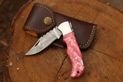 Hunting Folding Knife with Leather Cover (Damascus Steel Blade / Resin Handle )