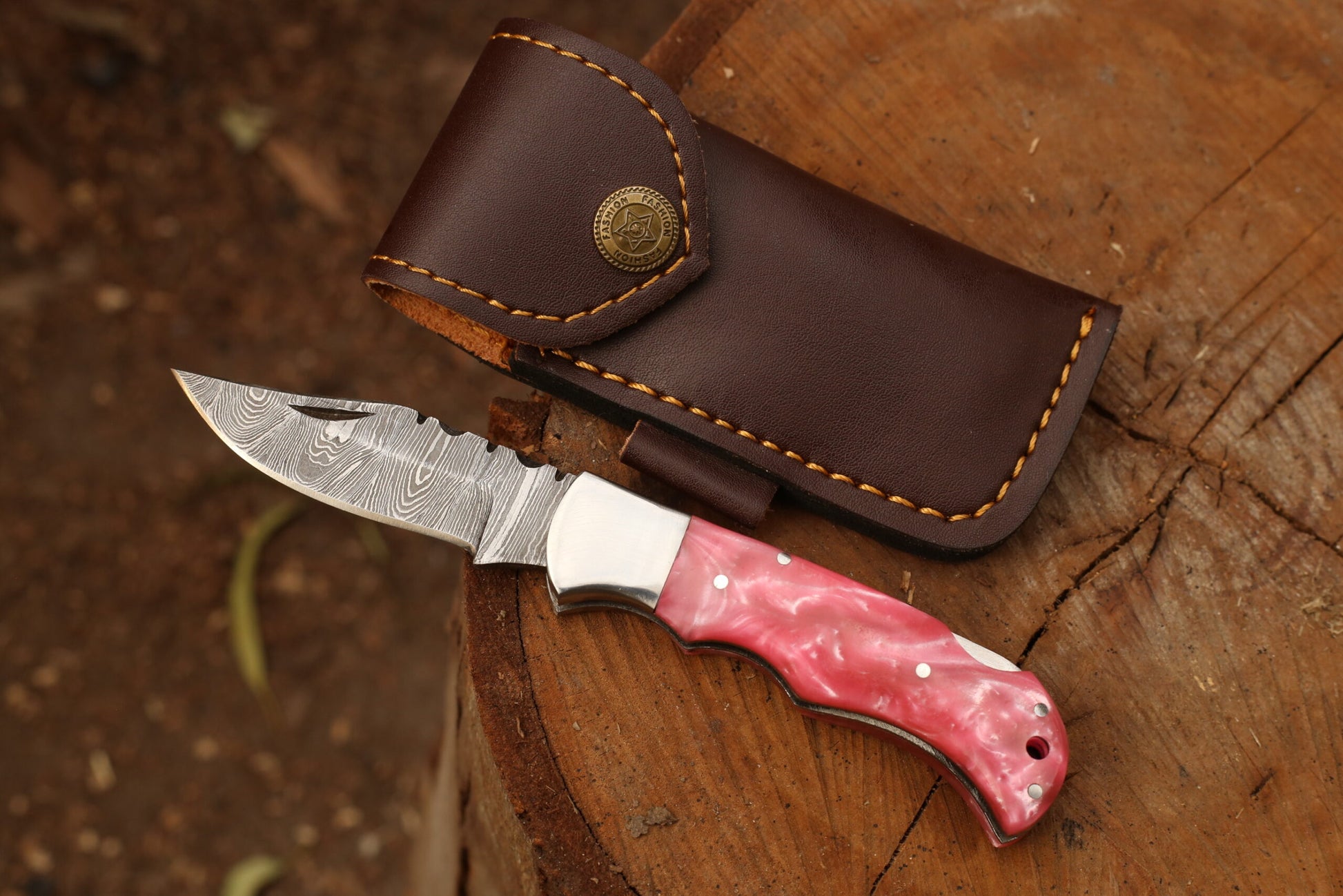 Hunting Folding Knife With Leather Cover (Damascus Steel Blade / Resin Handle)