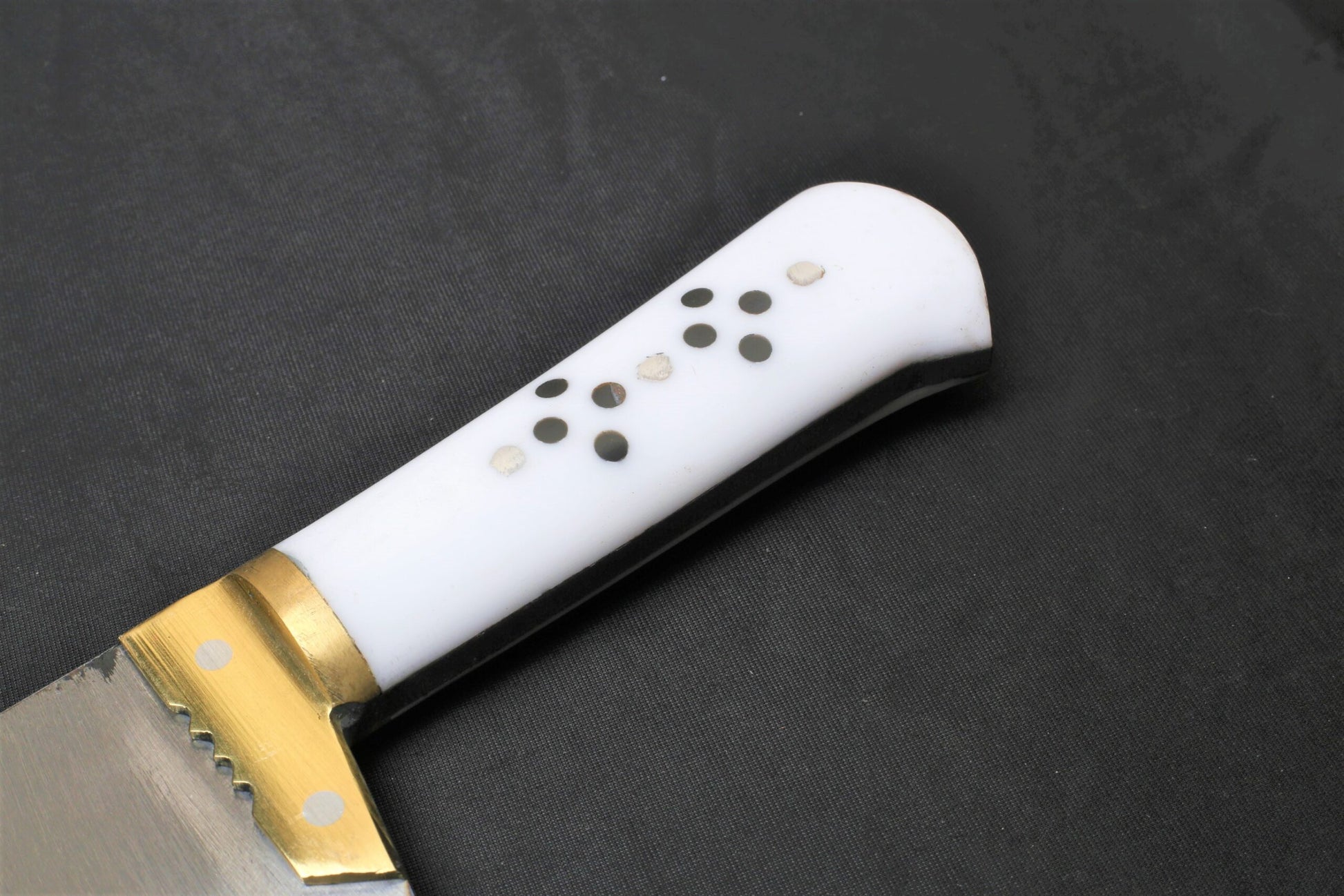 With a solid 1 KG weight, this bone cutter provides the perfect balance between force and control. The durable acrylic handle offers a firm, non-slip grip, while the brass bolster enhances strength, balance, and safety by reinforcing the joint between blade and handle. Built for reliability, this tool is ideal for butcher shops, slaughterhouses, and farm use.