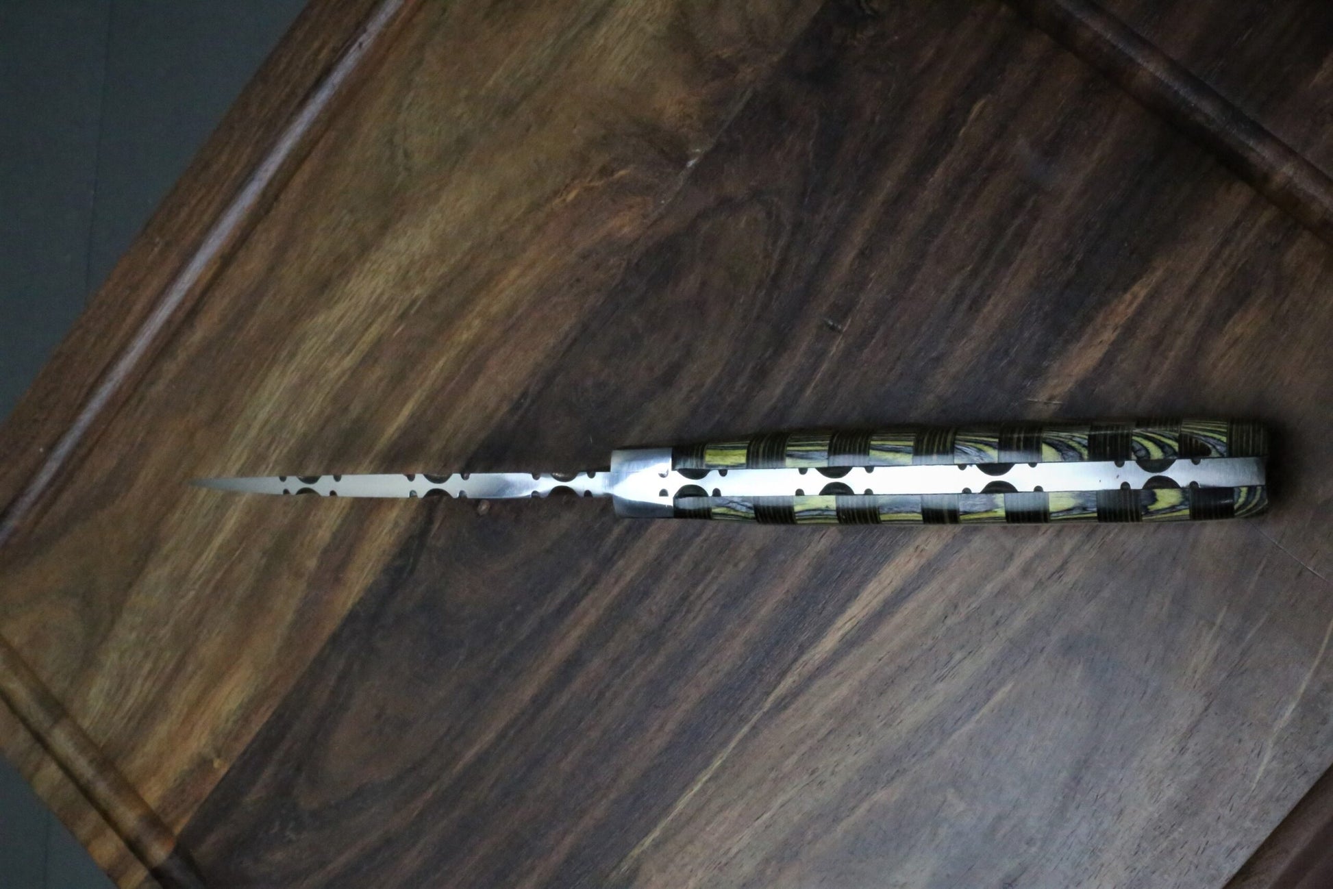 The handle is crafted from natural Chesswood, known for its unique grain, warm tone, and excellent grip comfort. Hand-polished to a smooth finish, it provides both aesthetic beauty and functional durability. The engraved blade adds a custom artistic touch, reflecting the skill of master craftsmanship.
